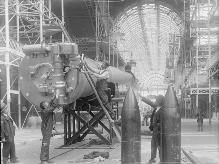 建造中的克莱夫号 理论上该舰可以搭载13.5英寸或15英寸大炮,但因缺少火炮,起初炮舰主炮塔全部搭载2门前无畏舰上拆下来的12英寸(305毫米)舰炮,辅助武器有2门反驱逐舰、鱼雷艇的QF 12磅炮,以及防空用的1门QF 3磅炮和1门QF 2磅炮。
