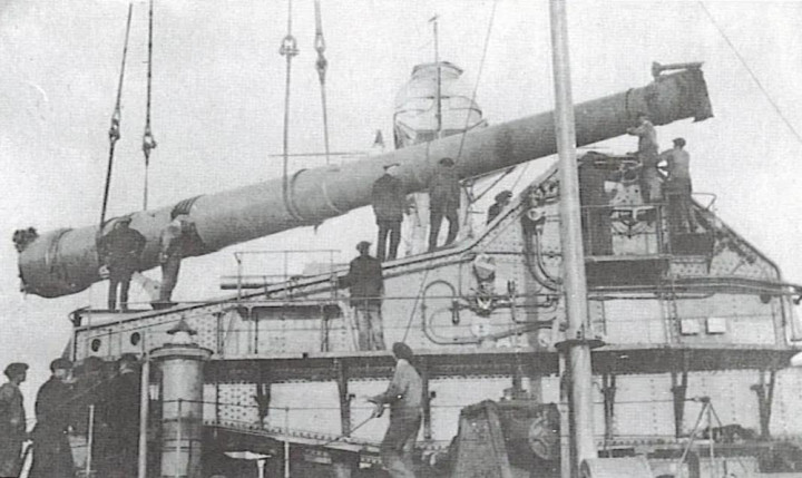 BL 18英寸舰炮 其实这样的火力配置也算中规中矩,双305毫米重炮在对陆轰炸中有明显的射程和威力优势,但在实战中持续升级武器,比如1916年新增2门QF 6英寸炮抵御驱逐舰。其中首舰克莱夫号和另一艘沃尔夫号接受了最强改装,安装了英国海军史上最大口径舰炮——BL 18英寸(457毫米)海军炮,这让它们获得了新的绰号“大象与城堡”。